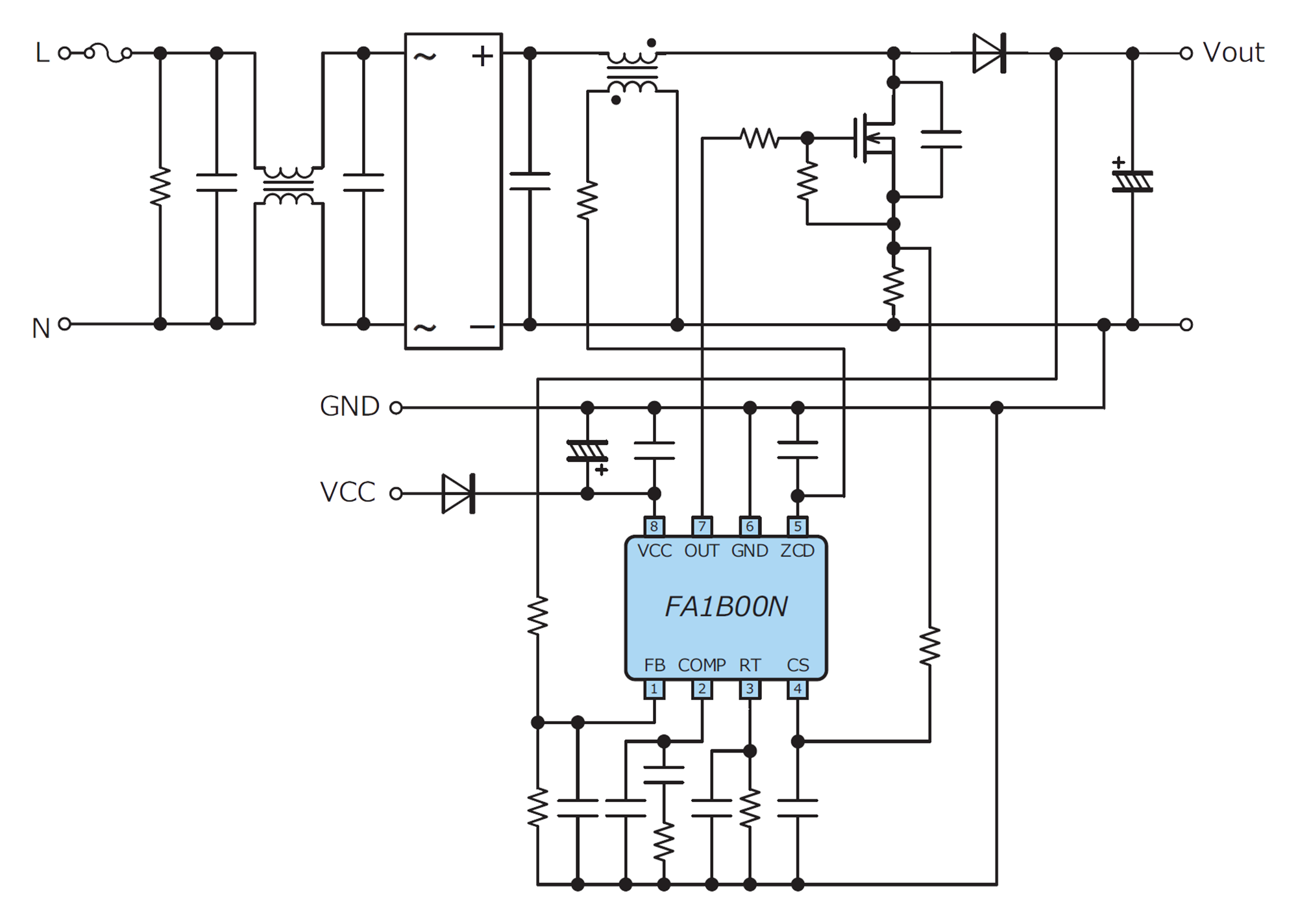 FA1B00N是一种控制IC,用于构成采用了临界模式的功率因数校正转换器。采用高耐压CMOS工艺,实现了低功耗。此外,还具备输出电压检测部异常时停止动作的FB短路检测电路等。
