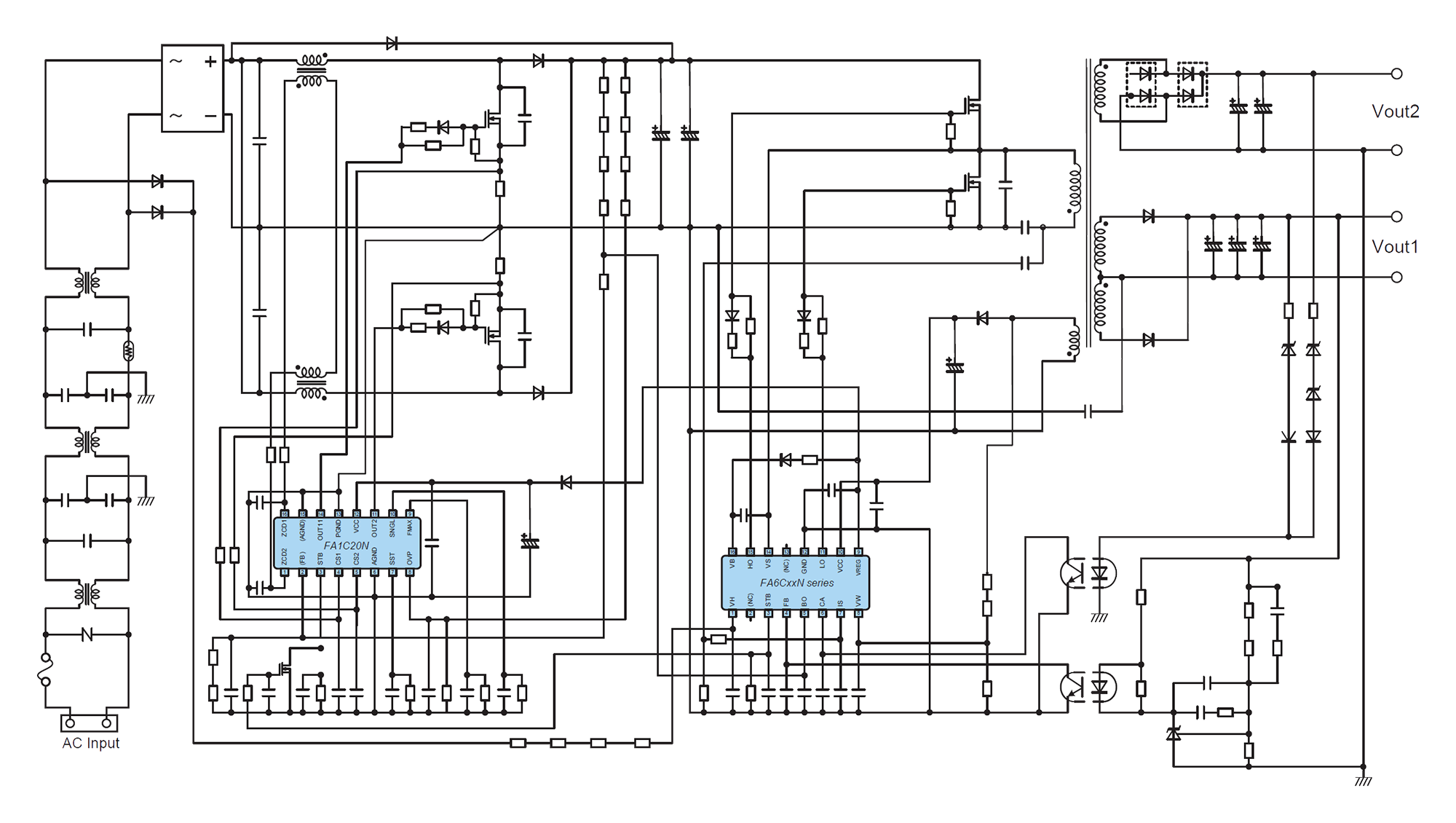 FA1C20N,为我司构成临界模式交错式PFC转换器的控制IC。采用高耐压CMOS工艺,实现低功耗。此外,本IC内置各种丰富的功能,如PFC输出电压检测异常时停止工作的短路保护。更有甚者,本IC可通过外部信号切换工作模式,与我司电流谐振ICFA6CxxN系列组合使用的话,可提高PFC电源的效率。